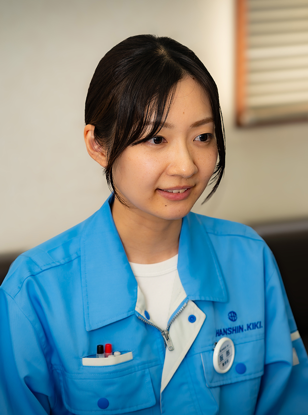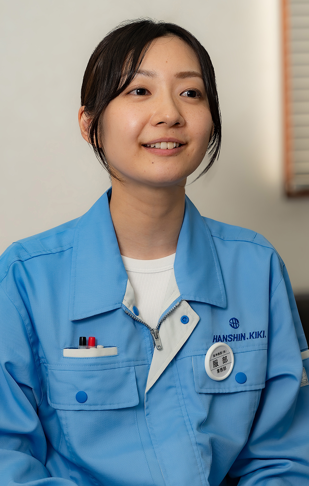 阪神機器で総務に就いてまだ5か月。フレッシュな笑顔が印象的な服部さんは、勤怠管理から給与計算、備品発注まで幅広い業務を軽やかにこなしている。「未経験で飛び込みましたが、分からないことを何度でも聞いていいと言ってもらえたおかげで、安心して挑戦できています」と話す声には、自信と感謝が滲む。